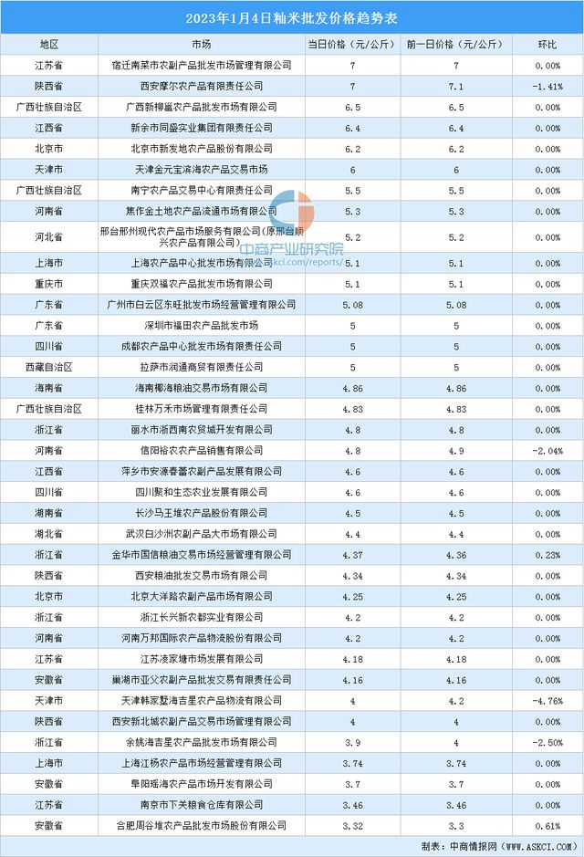 中商情報網(wǎng)訊:最新數(shù)據(jù)顯示:1月4日,全國粳米當日均價為5.19元/公斤,秈米當日均價為4.83元/公斤。其中,粳米價格最高的市場是位于江西省的新余市同盛實業(yè)集團有限責任公司,當日價格為9.3元/公斤,環(huán)比持平。秈米價格最高的市場是江蘇宿遷南菜市農副產品批發(fā)市場管理有限公司和陜西西安摩爾農產品有限責任公司,當日價格均為7元/公斤。